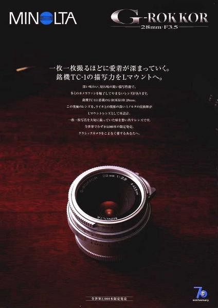1998년 미놀타의 70주년을 기념한 제품군 중 하나인 이 렌즈는 TC-1 의 성공을 바탕으로 2,000개의 한정판으로 발매되었다. 블랙버젼의 TC-1 역시 2,500대 한정으로 1998년 발매되었다. 블랙버젼의 TC-1 은 현재 멋지고 휘귀한 필름카메라로서 상당히 고가에 거래되고 있는데, 28mm G-ROKKOR LTM 렌즈의 시세는 그에 미치지 못하고 있다. 보통 써드 파티의 교환식 렌즈는, 그것을 디지털 바디에서 사용할 때에 아무런 문제가 없어야 그 가치를 높게 평가받는다. 후옥돌출형의 설계구조상 주변부 마젠타 캐스팅이 많이 발생하는 이 렌즈는 별다른 인기를 끌지 못하였다.