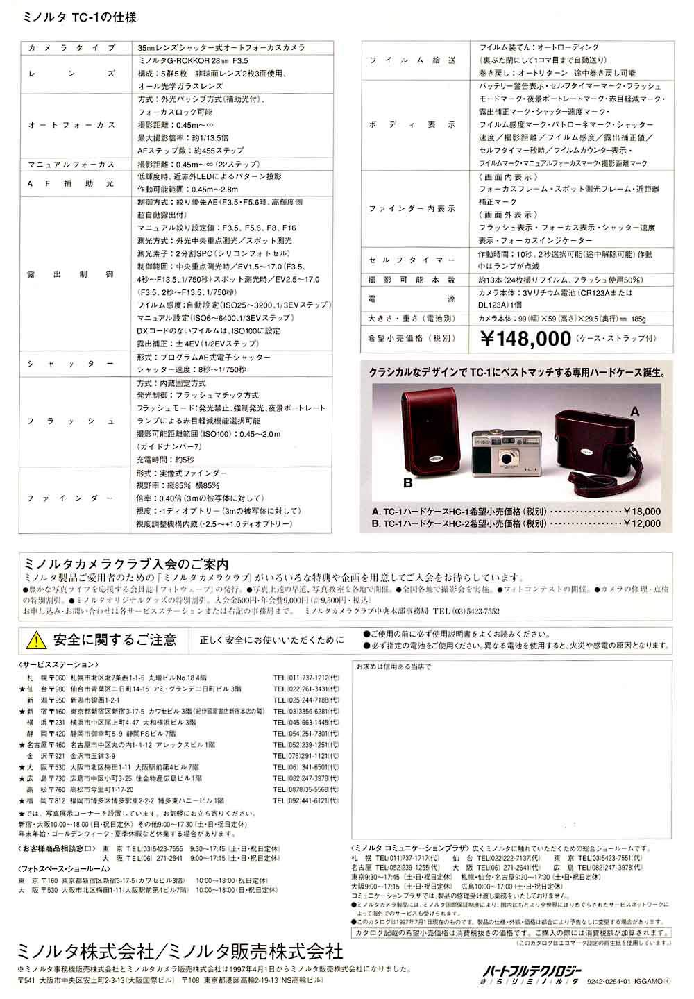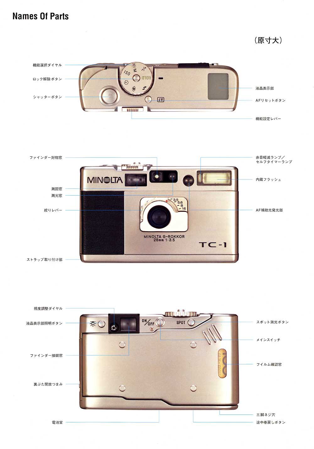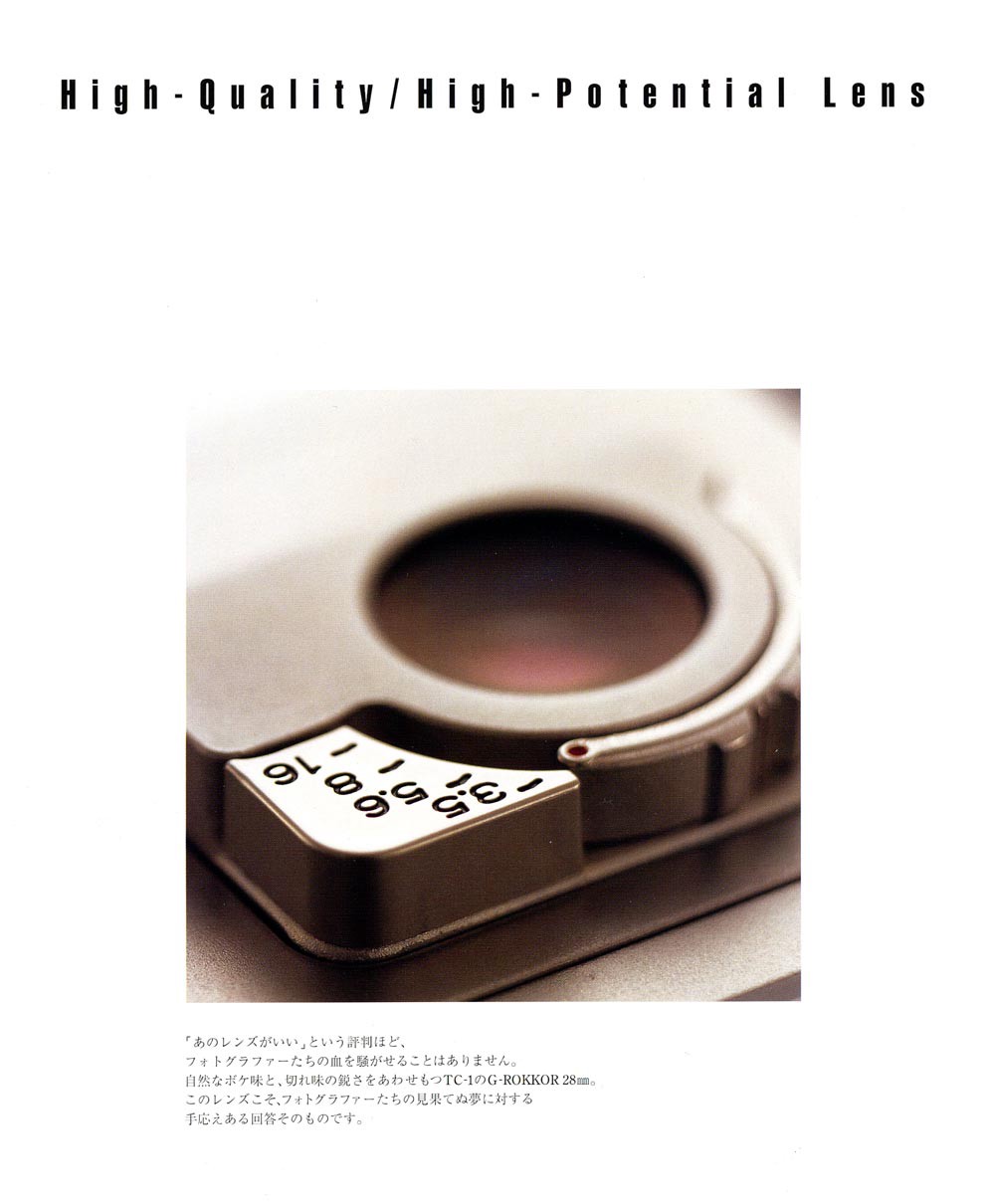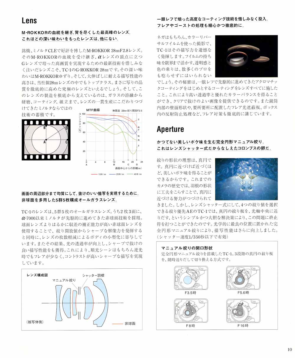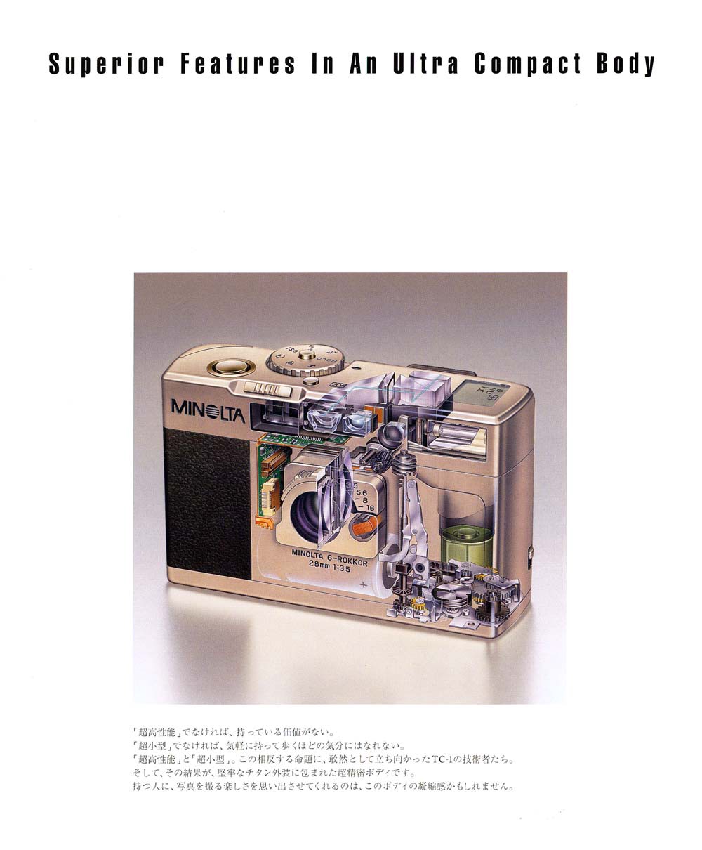 TC-1 의 렌즈인 G-ROKKOR 는 미놀타를 대표하는 전통 렌즈 ROKKOR 라는 이름에, 최상위 렌즈군에 붙이는 G 를 붙인 네이밍이다. 이 카메라 프로젝트에 임했던 엔지니어들의 남다른 각오를 엿볼 수 있다. 5군 5매의 접합제를 사용하지 않은 렌즈 구조, 2매, 3면의 비구면 렌즈, 최단초점거리 0.45m, 완벽한 원형 조리개, 작지만 맑고 시원한 파인더, 가이드넘버7의 내장 플래시, 전문가들에게 필요한 spot 측광을 지원, 8초에서 1/750초의 셔터스피드, 휴대시 초박형, 미놀타 특유의 부가기능들, 고급 티타늄 소재 마감, 등등... 사실상 원가절감같은 것은 고려치 않고 좋은 것을 작은 몸체에 다 때려박았다.
