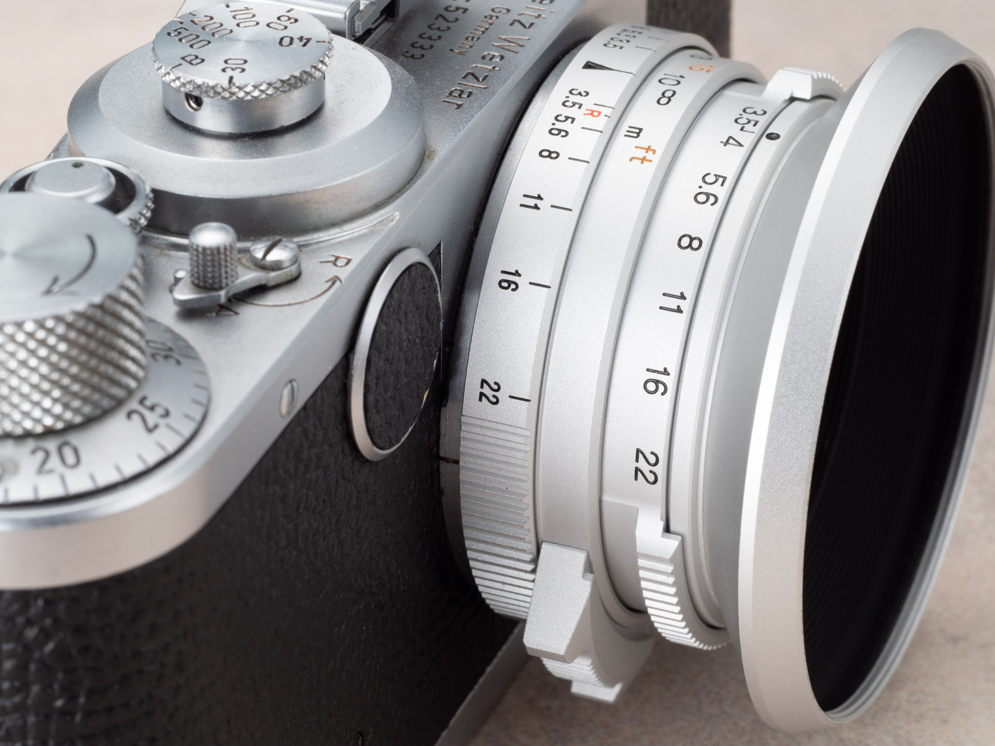 마운트는 LTM 이지만, 마운트 기저부는 M마운트에 딱 맞게 제작을 하였다. 그리하여 LTM adapter 를 연결하여 M 바디에 꽂으면, 완전체를 보는 것과 같이 부드러운 연결선을 보여준다. LTM 렌즈라고 해서 바르낙에 사용해야 한다는 강박을 가질 필요가 없다. 이 렌즈는 M 바디가 제일 잘 어울리고, 사용하기도 편리하다.
