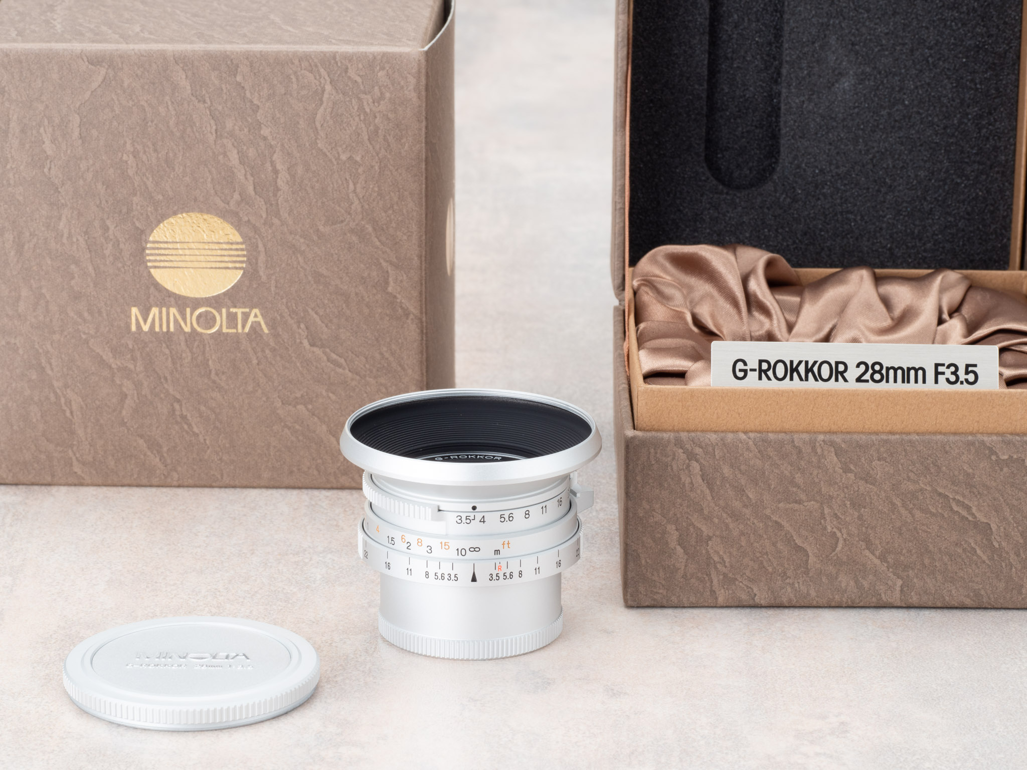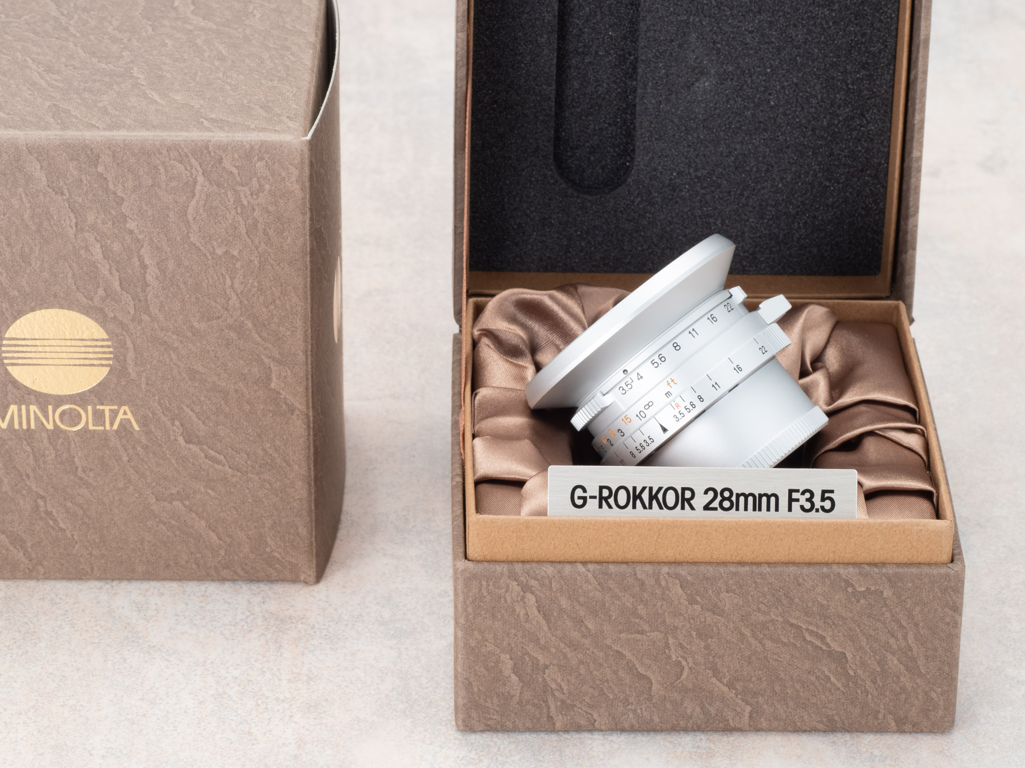 금속으로된 'G-ROKKOR 28mm F3.5' 팻말이 포함이 되어 있는데,
