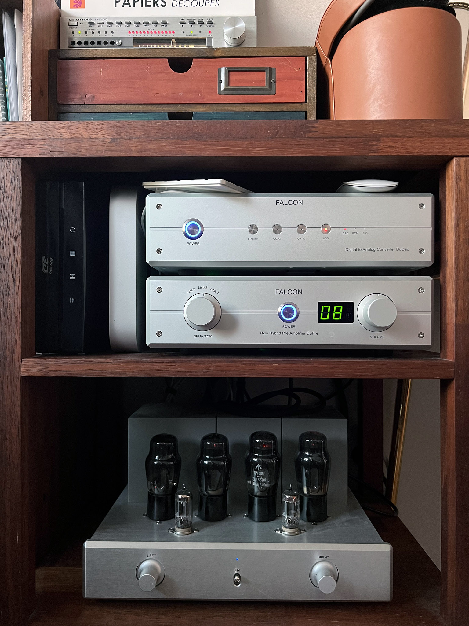 안방에서 듣는 간략한 시스템이다. '빈티지오디오카메라' 네이버카페에서 공제한 두꺼비(KCC 정회장님 별명) 시리즈에 서원호 형님을 조르고 졸라 만든 6V6 PP amp 를 물렸다. 스피커는 천장형 스피커인 AM-1 을 셋팅했는데, 이 야외용 스피커의 성능이 생각보다 발군이다. 침대에 누워서 들을 수 있는 구조로 셋팅해놓고 쓴다. 프로젝터로 영화등을 볼 때도 요긴하고 사용하고 있다.