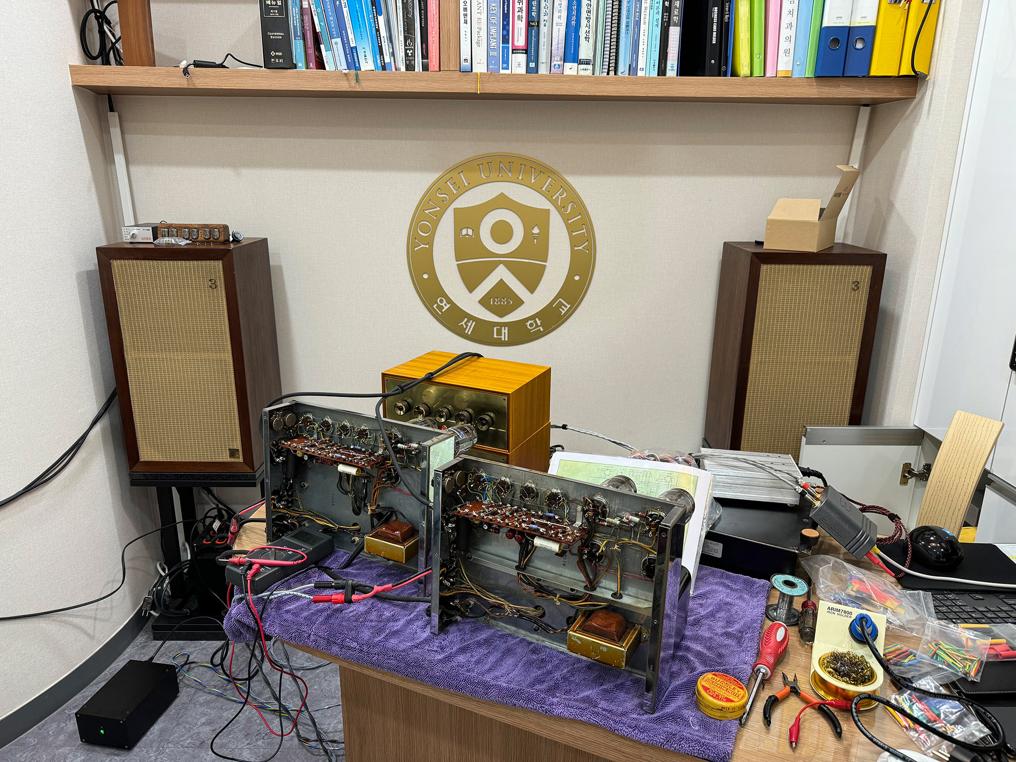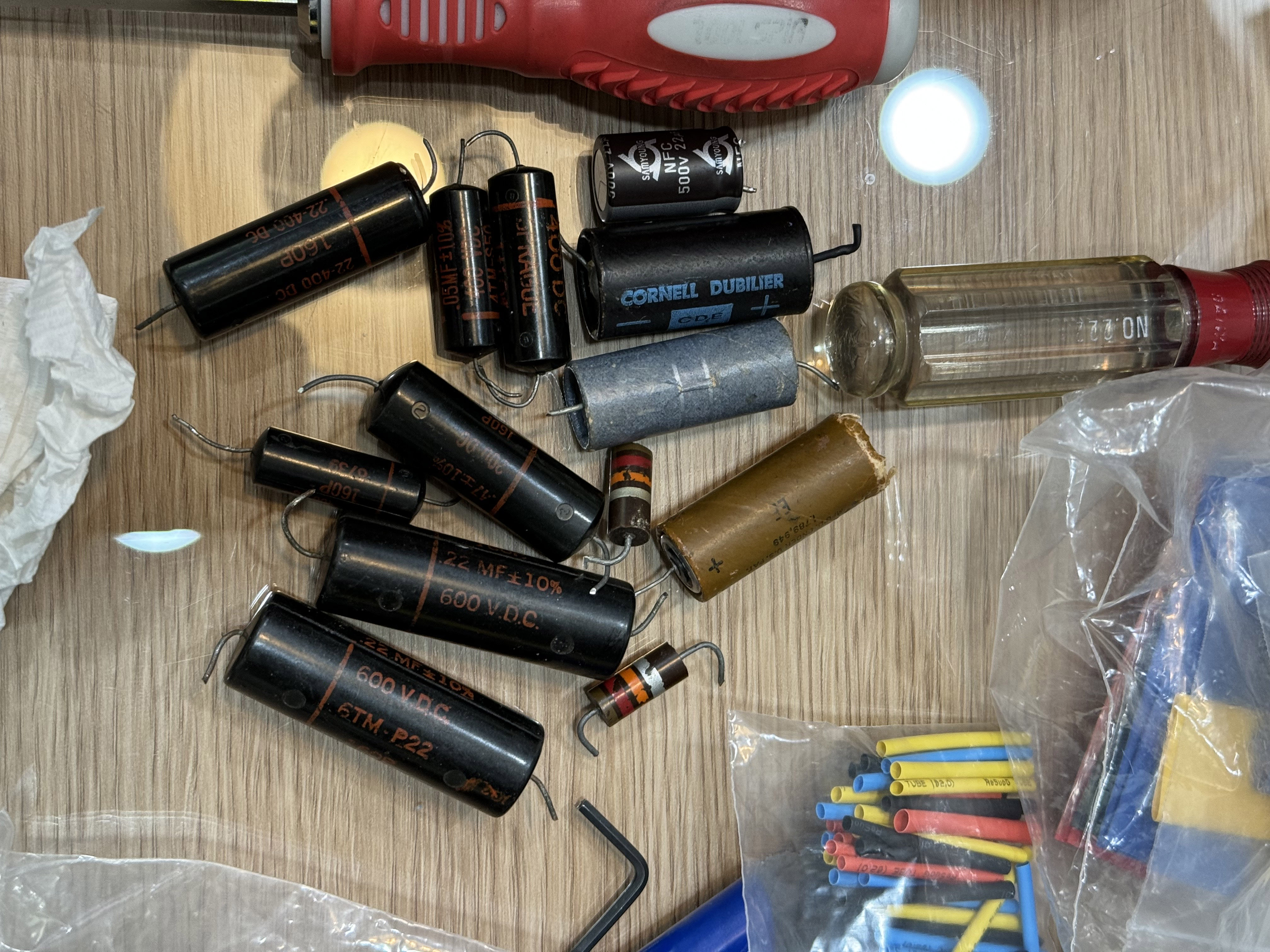 좌측의 레몬색 부품은 특주한 한국산(부품 중 유일하게) 부품인데, 한국 진공관 동호회 블라인드 비교 테스트에서 1위를 차지한 부품이라고 한다. (생긴 건 그저 마이쮸에 철사 꽂은 것 같은데 ㄷㄷㄷ)