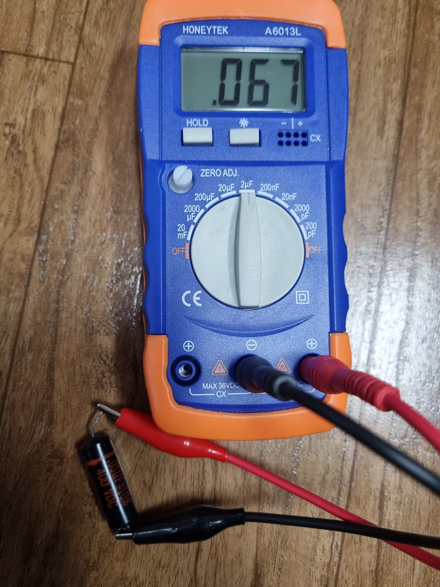 첫번째 사진의 콘덴서는 0.047마이크로패럿이라고 씌여 있지만 0.067마이크로패럿으로 측정된다.
